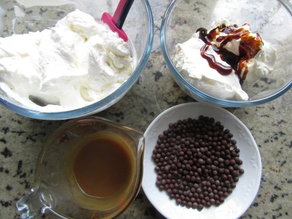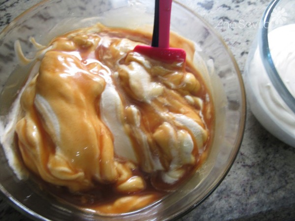 1- Semi-montar la nata con el azúcar y vainilla unos segundos a vel. 4 y medio. Dividir en dos boles y a uno echar casi todo el toffe frío (Dejaremos como 50 gr. para adorno final).