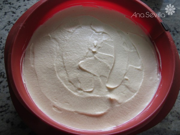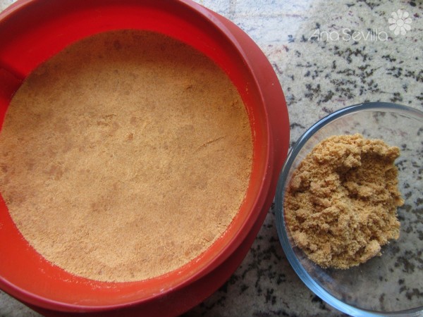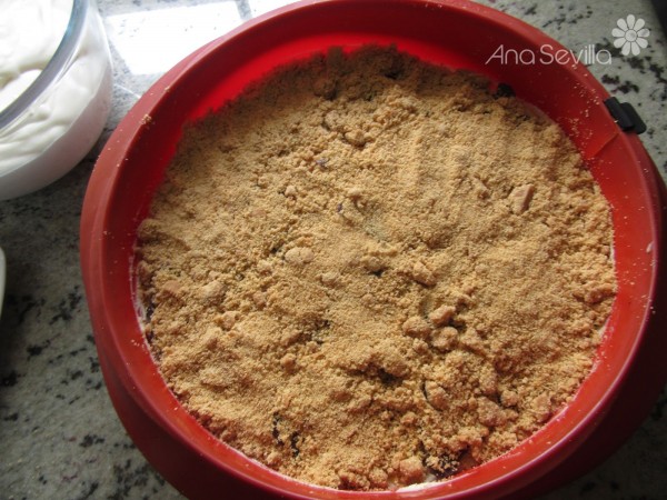 Reservar unos 100 gr. de la mezcla en un bol y el resto forrar el fondo de un molde desmontable de unos 23-26 cm. apretando y alisando bien y llevar a la nevera.