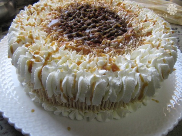 3- Repartir por el centro bolitas de chocolate y cereales, montar 400 gr. de nata con 40 gr. de azúcar glas, dividir en dos y a una parte echar un buen chorreón de caramelo líquido. Adornar con ambas natas con manga pastelera y boquilla rizada.